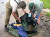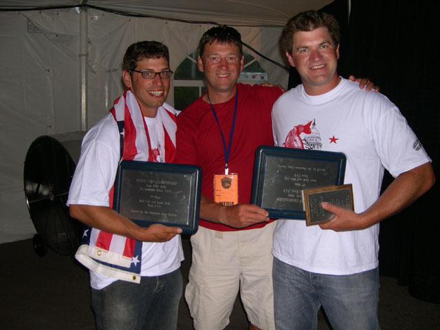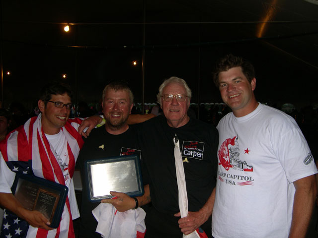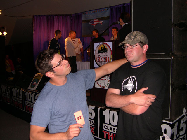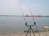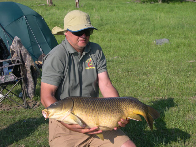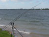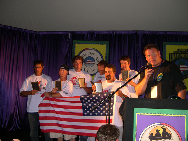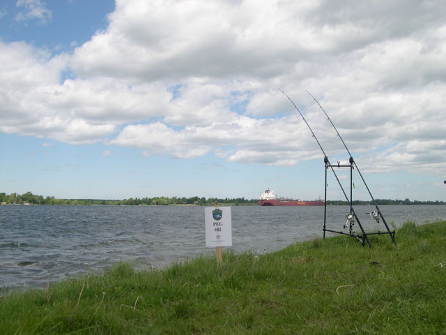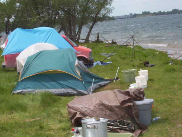 in winnings between us. Better every minute... Later that night was the peg draw. Teams pull numbers for their location on the bank. we got peg 82, it seemed ok on the depth contour map. We were lucky to not be stuck on an island. Those teams had to be shipped slowly and tediously via cattle barge to their locations. We did have to drive several miles down treacherous dirt roads, but it was worth it to have the comfort of our van should we need it. As we closed in on where our peg should have been, we found a barbed wire fence. "It can't be in here, can it?" We waited around a bit and finally a marshal drove up and informed us that our peg was in a cattle pasture... "They're friendly." Yes they were. We had to chase them away from our bait a few times. The St. Lawrence is called a "Seaway." That's just how big it is. You could almost run and jump from shore into 20+ feet of water. 30 feet from shore, it was over 30 feet deep. Anglers have to keep their rod tips high to stay above the sharp zebra mussels that lie on the edges of the steep drop-offs. Many huge ships floated by and sent waves crashing on our bank. By the end of day one we were one of only a few teams that had fish on the bank. This had us in second place. I caught 2 channel cats bigger than I have ever seen. Both over 10 lbs. Our conditions soon worsened with 25 mph winds, strong current, and large clumps of weeds that caused us to loose over 20 fish by the end of the tournament. We spent Monday trying to keep our gear from blowing away, and visiting the Romanian team. They were the only competitors within walking distance. Here is Soren, our new friend with a 30+. Tuesday night our super support staff, Donnie, showed up. As our official runner, he was not allowed to touch any rods, bait or rigs. But this boy can cook a mean camp meal. Salmon with asparagus in cream dill sauce, was one of many fine meals we enjoyed between fish. He was allowed to hold a fish for a picture too... Here is our shanty town where it all went down. Don brought with him some good luck too. The winds died, current changed and fish started screaming the minute he showed up. This one was going to be big. We knew it. It weighed in at 37lbs 4 oz, but we didn't have it weighed until the next day. We were convinced it was over 40, and the big fish leader until then. It ended up being the 5th biggest of the tournament. Tuesday night and Wednesday morning our fishing really took off. The conditions were much better, and we had figured out the patterns of the fish in our swim. Our weigh in Wednesday morning was over 200 lbs. The picture below has some of those fish. Included are a 29, a 30, and 3 over 25. I bet you are wondering where we kept 7 fish overnight. Matt had custom fish sacks made so we could safely store the fish. This is a common practice in Europe. The sacks are made of soft mesh that water passes through freely, and won't injure the fish. Because of the waves from the wind and ships, we wanted to make sure the fish were in deep water and would not be smacked into rocks. So we built this buoy-rope system that kept them high in several feet of water. When the weigh marshal came, we put the sacked fish on a floating mat, and floated them to shore. By Thursday night we had caught over 700 lbs. But it hadn't registered online yet. We knew we were in the top 3, but no one else did. We had to tell the marshal that our "live" weight was off by over 200 lbs. Despite a horrible thunder storm, we caught another 30 Thursday night, and several more by Friday morning to put us up to 830 lbs 4 oz.