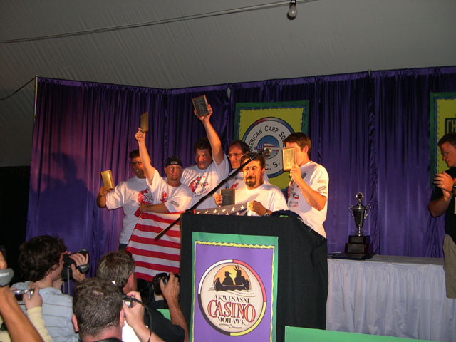 back at the casino. Talk about a nail biter! Matt and I at the podium, thrilled to be in third. Team Capital members John Tilbrook and Stewart Mckenzie, who overtook us for second. One of our new friends, Przemek from Poland. The well deserved winners, Steve Briggs, and Tim Paisley, 2 real stars in the carp world. Then it was back into the casino to celebrate at the bar with all of our friends, old and new. What a scene. No cameras allowed though... We left bright and early the next day on our return trip. We again stopped in the Poconos to relax and gather our wits. This time, Pines lake was also generous. I landed a largy easily over 4 lbs, and a bullhead. Matt caught a nice crappie. In the two trips we made to this lake, we landed a respectable fish of every species in this lake, except for sunfish and yellow perch. After that, we slept in, and headed to the Lehigh River below Francis E. Walter Dam. We caught a few nice smallmouths and called it a day. Overall this was the experience of a lifetime. I can't put into words just how much this trip meant to me. I hope we can do it again next year in South Africa. This time we'll be shooting for first! Louis |